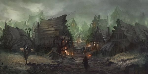 Subtle hints of blue in the background suggest the mysterious mists that blanket the land, adding a cool undertone that enhances the setting’s sense of isolation and supernatural unease.