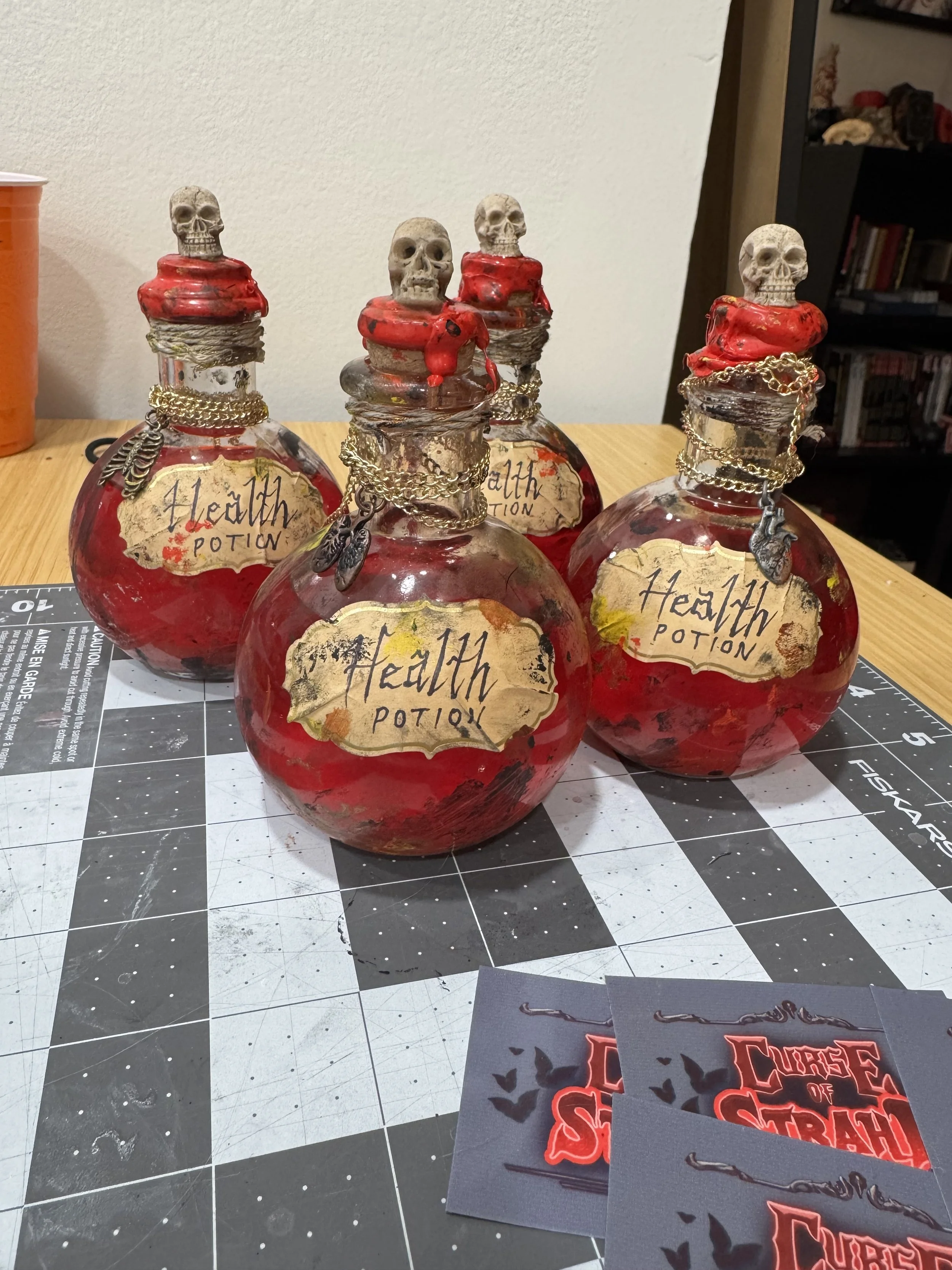 To deepen player immersion, I designed and fabricated interactive Health Potion props using glass bottles filled with drinkable red shimmer. Each bottle was hand-painted and aged with layered ink and tea staining to achieve a convincingly weathered, in-world aesthetic.