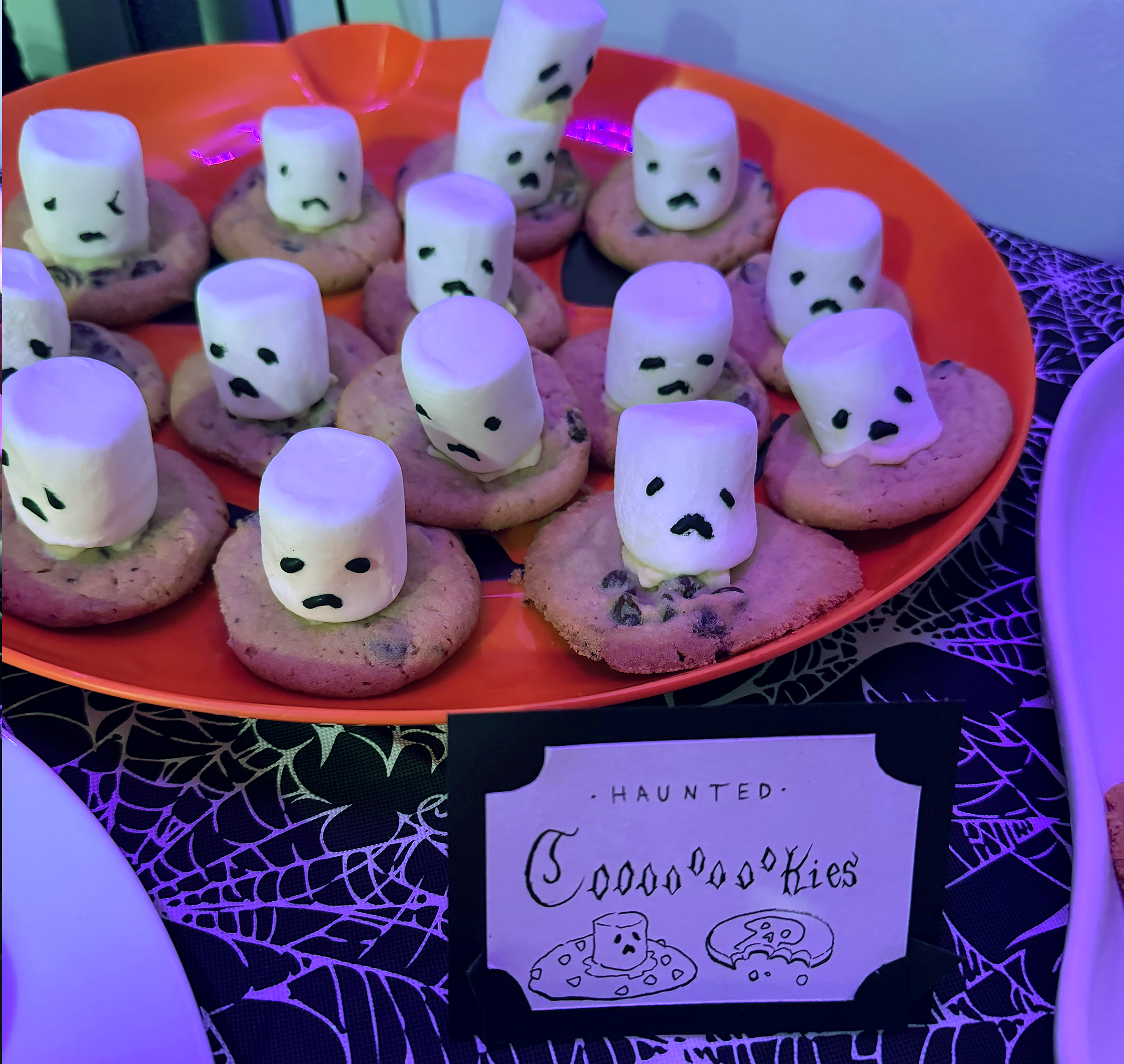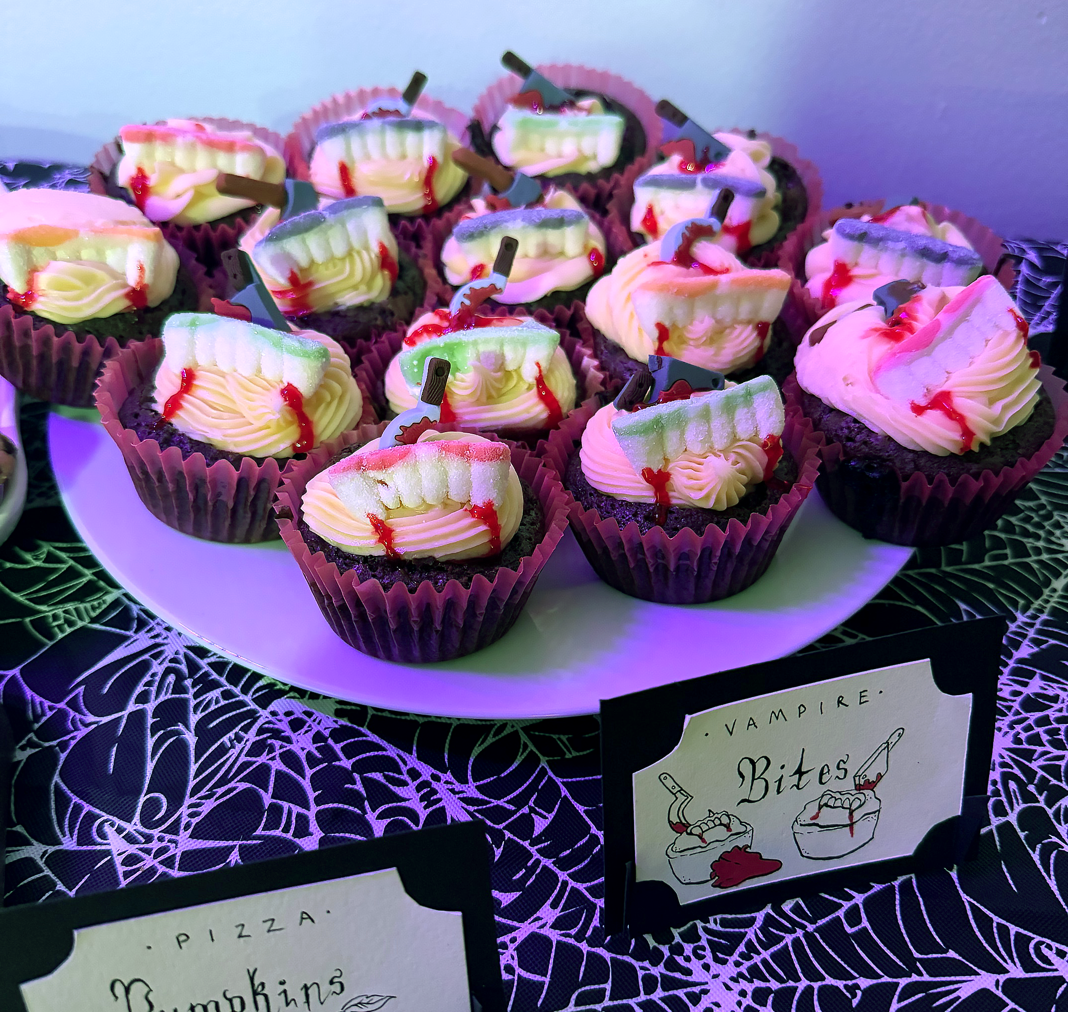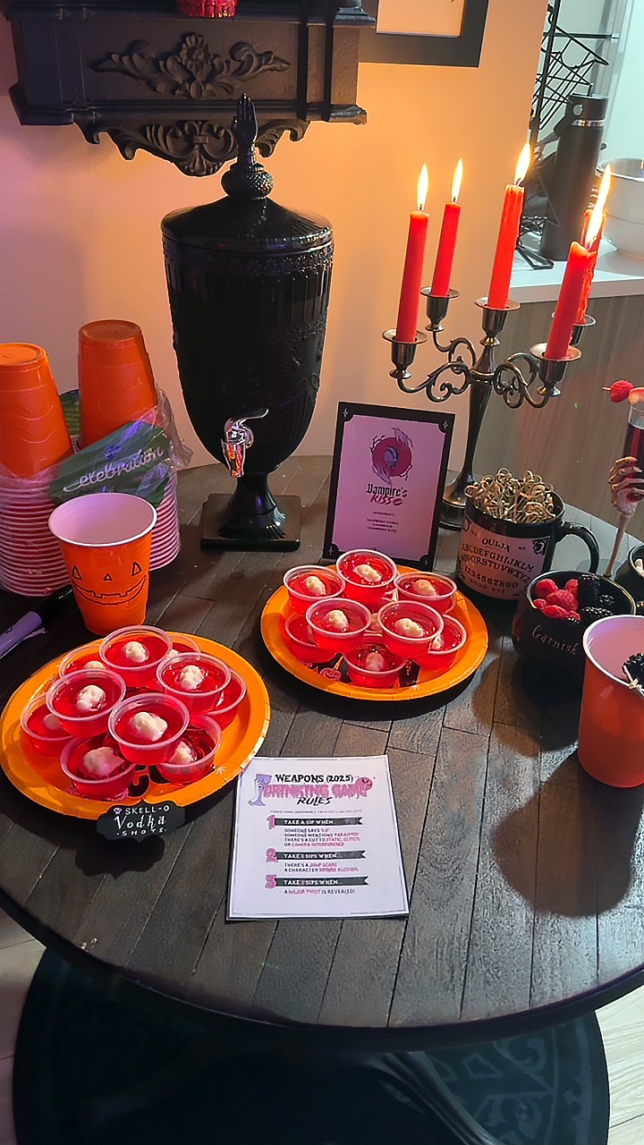 The Vampire’s Kiss cocktail wasn’t the only refreshment served at the party—there was also a snack station featuring a variety of spooky-themed dishes and treats which I designed handmade labels and place cards for. Pizza pumpkins, devil eggs, vampire brownie bites, skell-o vodka shots, and haunted coOoOokies were just a few among the food options, each recipe chosen for their visually unique, creative take on classic party snacks with a Halloween twist!