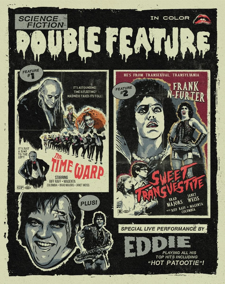 The Rocky Horror poster on the left served as an initial visual reference for the project and helped establish the overall direction for the design. From there, I collected images of classic horror posters and vintage comic books, focusing on how they balance their chaotic compositions with bold, eye-catching typography and striking iconography.