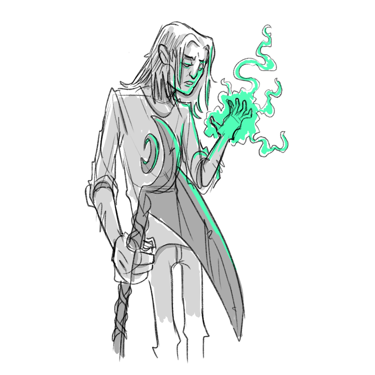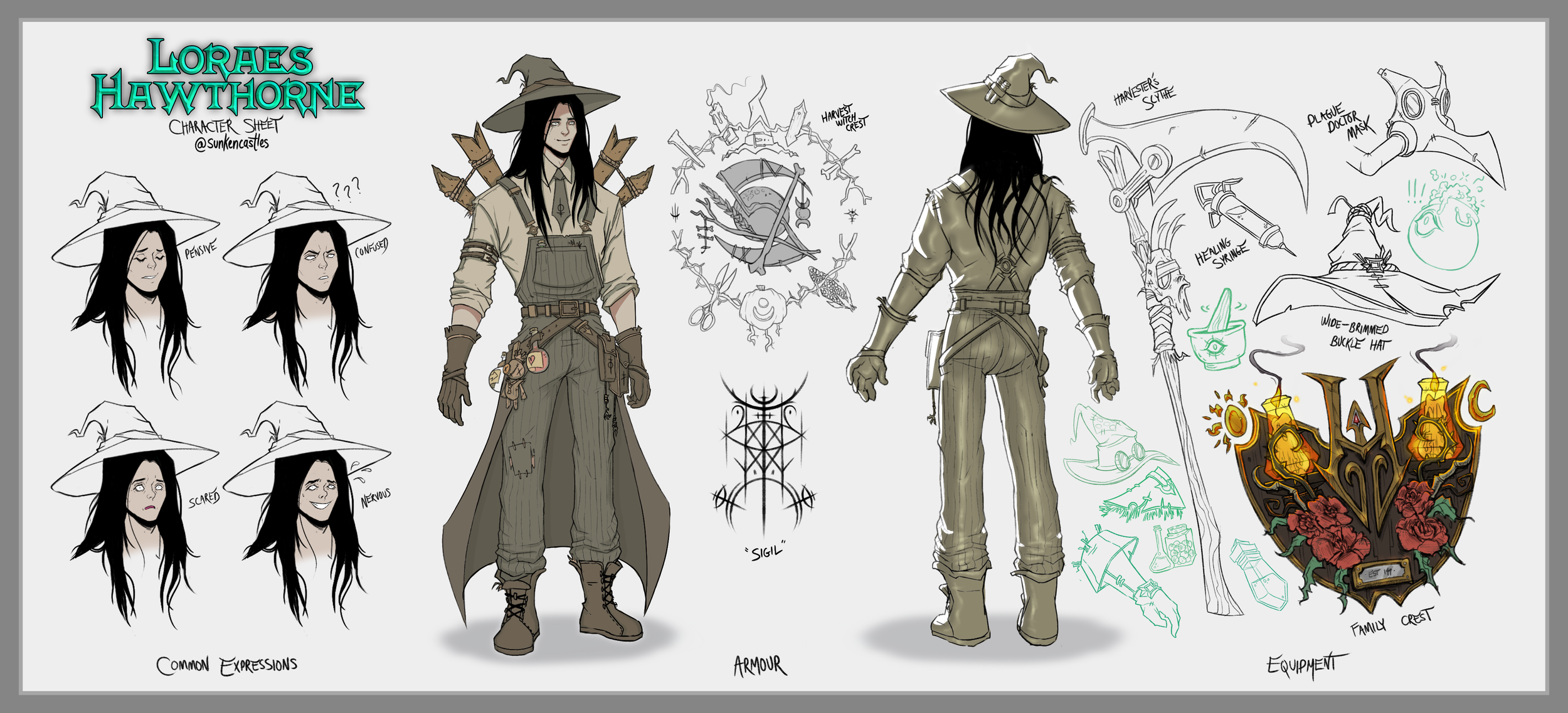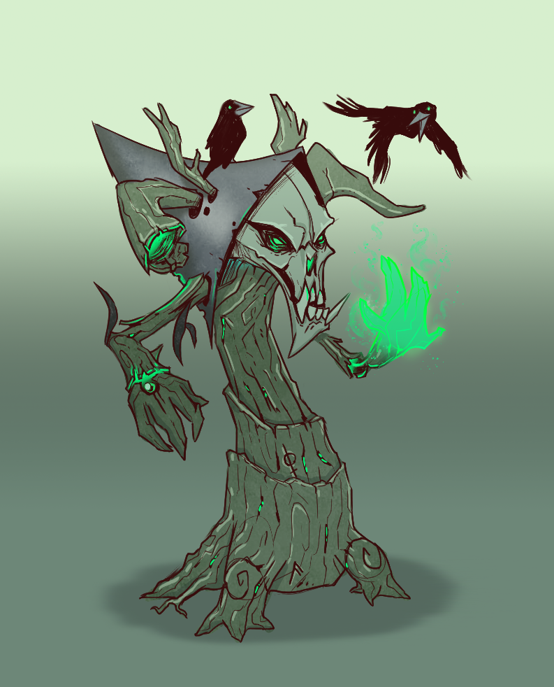 Loraes Hawthorne is a blind druid bound to a parasitic entity (known as Death), forcing him to navigate the tension between preserving life and wielding necromantic power. His design explores themes of balance, corruption, and duality through both natural and macabre visual elements.